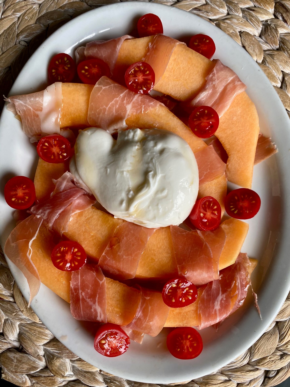 - Layer all your cantaloupe, prosciutto, and tomatoes on a platter. Set your burrata in the center and drizzle agave on top. Voila!