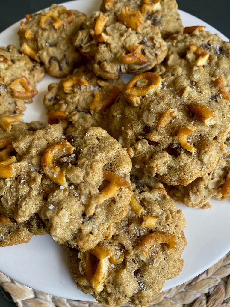 No matter the angle, these choc-oat-chip cookies dusted with pretzel and sea salt flakes knock it out of the park! Adapted from Half Baked Harvest’s cowboy cookies. Try these out ASAP.
