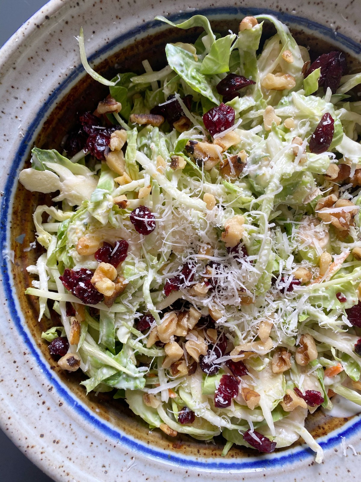 Potlucks and weekday lunches prepare yourself, one broccoli & brussels slaw with creamy lemon dressing, dried cranberries, and walnuts… coming right up!